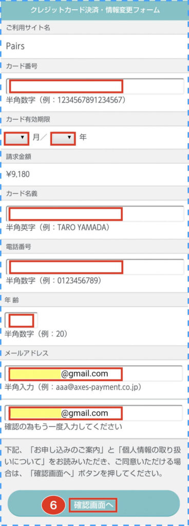 上記スクショの赤枠部分に、カード番号や有効期限、カード名義などを入力して、❻の「確認画面へ」をタップします。